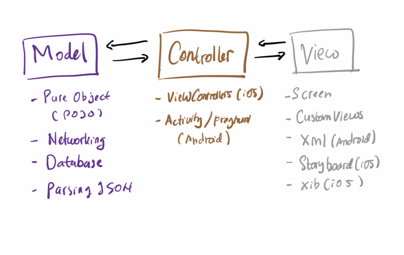 Pada diagram diatas, Activity / Fragment (Android) dan ViewController (pada iOS) dianggap sebagai Controller, karena menjembatani antara Model dan View. Sedangkan xml (Android) dan Storyboard / xib (iOS) dianggap sebagai View. Sedangkan, model tetap sama.