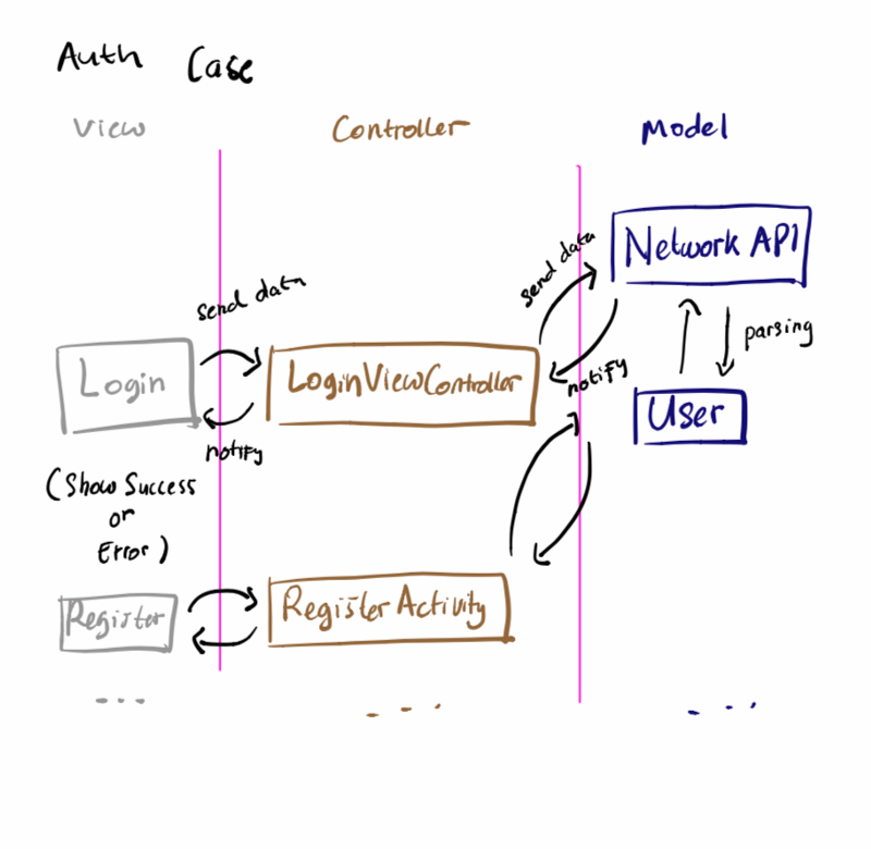 View mengirim data (misalkan email dan password) kepada Controller. Kemudian, Controller mengirim data ke Model yaitu NetworkAPI untuk melakukan autentikasi. Setelah melakukan request, kembalian object User didapat. Kemudian akan dikembalikan ke Controller dan ditampilkan ke View.