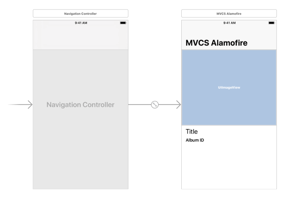 The view represent how the data will rendered to the view. The storyboard file for this case is responsible for this layer. Here, I create simple view that holds UIImageView and two UILabel to show it to the user. Also, hook up it to the ViewController so we can interact with the view components via code.